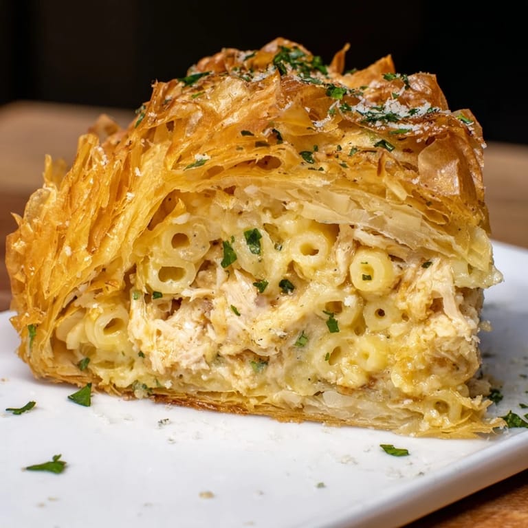 Save I discovered this recipe while scrolling through social media and getting distracted by yet another viral food trend, but something about it made me pause. The phyllo crinkle cake looked chaotic and beautiful at once, and I thought, what if I made it savory? That night, I started experimenting with leftover rotisserie chicken and pasta, layering them between those crispy, buttery sheets, and when it came out of the oven golden and crackling, my kitchen smelled like a fusion of every comfort food I loved.