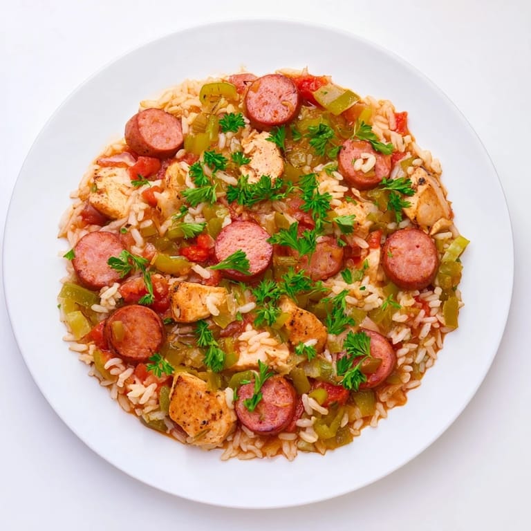 Save A hearty, oven-baked version of the classic Louisiana jambalaya packed with tender chicken smoky sausage and aromatic vegetables in a flavorful tomato rice base