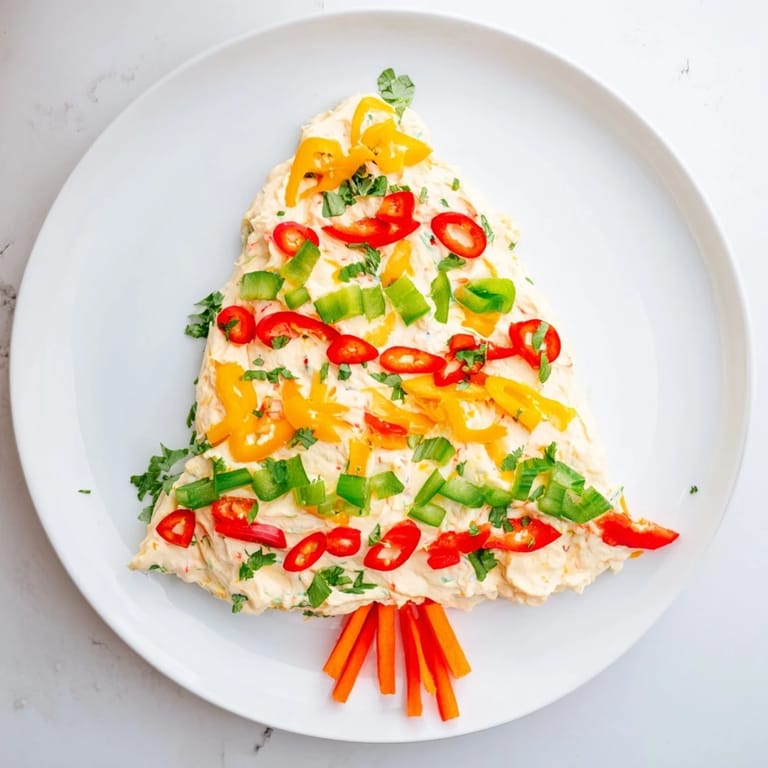 - Decoration & Topping: 2 to 3 fresh red chili peppers, thinly sliced into rings, 1/2 green bell pepper, diced, 1/2 yellow bell pepper, diced, 2 tbsp chopped fresh cilantro, 1 small carrot, sliced into thin strips (for the tree trunk), Crackers or vegetable sticks, for serving