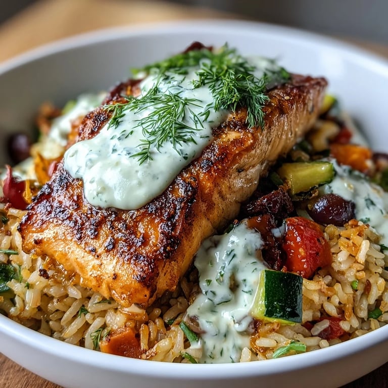 Save Experience a delightful contrast of textures and bright Mediterranean flavors with this Crispy Rice Salmon Bowl. This dish features succulent, pan-seared salmon fillets served over a bed of jasmine rice that has been crisped to golden perfection in a skillet. Accompanied by a vibrant sauté of zucchini, bell peppers, and cherry tomatoes, and finished with a zesty lemon-yogurt drizzle, it is a healthy and satisfying meal that feels truly gourmet.