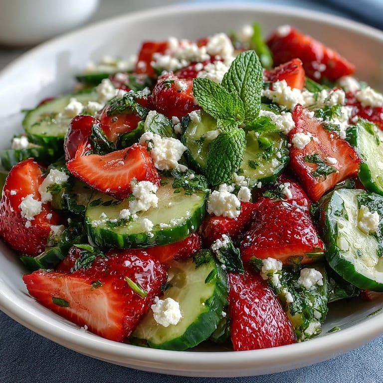 Save Last spring, I was standing in my kitchen on a Tuesday afternoon when my neighbor knocked on the door with a basket overflowing with strawberries from her garden. The berries were still warm from the sun, and I had just pulled a bunch of cucumbers from the farmers market that morning. Within minutes, I'd thrown together this salad almost by accident, but it became the thing everyone asked for all season long. There's something about the simplicity of it that keeps you coming back—no cooking required, just fresh ingredients that taste like the season itself.