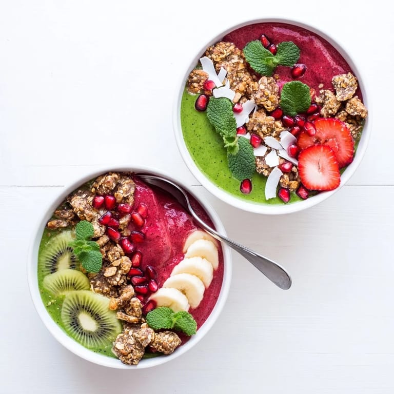 Save Vibrant, refreshing smoothie bowls bursting with holiday colors and flavors. Perfect for a festive brunch, these bowls layer red berry and green spinach-kiwi smoothies, topped with colorful fruits and crunchy granola.