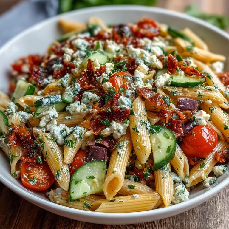 Save There's something about summer that makes me crave cold pasta salad, and this Greek version was born from a lazy afternoon when I couldn't be bothered to turn on the stove. I'd just returned from the farmer's market with a bag of perfectly ripe tomatoes and crisp cucumbers, and somehow a container of creamy feta found its way into my basket too. Within minutes of tossing everything together, I realized I'd stumbled onto something that would become a permanent fixture at every outdoor meal I host.