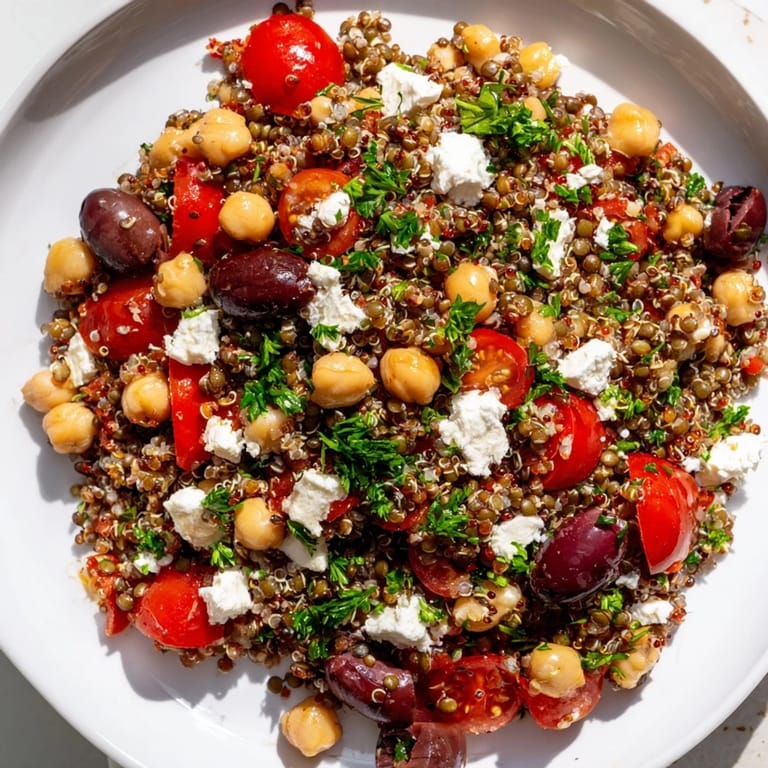 You can swap quinoa for farro or bulgur if you want a chewier texture, or use canned lentils to save time. Lemon juice works beautifully in place of red wine vinegar if you prefer a brighter, citrusy kick. For added protein, toss in grilled chicken, shrimp, or even a soft boiled egg. If you're not a fan of olives, try sun dried tomatoes or roasted red peppers instead; they bring a similar savory punch without the brine.