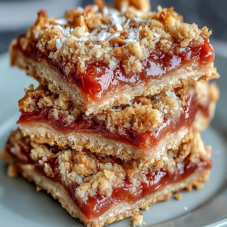 The genius of these bars lives in the contrast: buttery, crispy crumble meeting soft, jammy center with a substantial oat crust underneath. It's not uniform like a cake, and that's the whole point—your teeth get to work, flavors reveal themselves in layers, and you slow down to actually taste something instead of just eating it. When all three textures hit at once, you understand why this combination was worth pursuing.