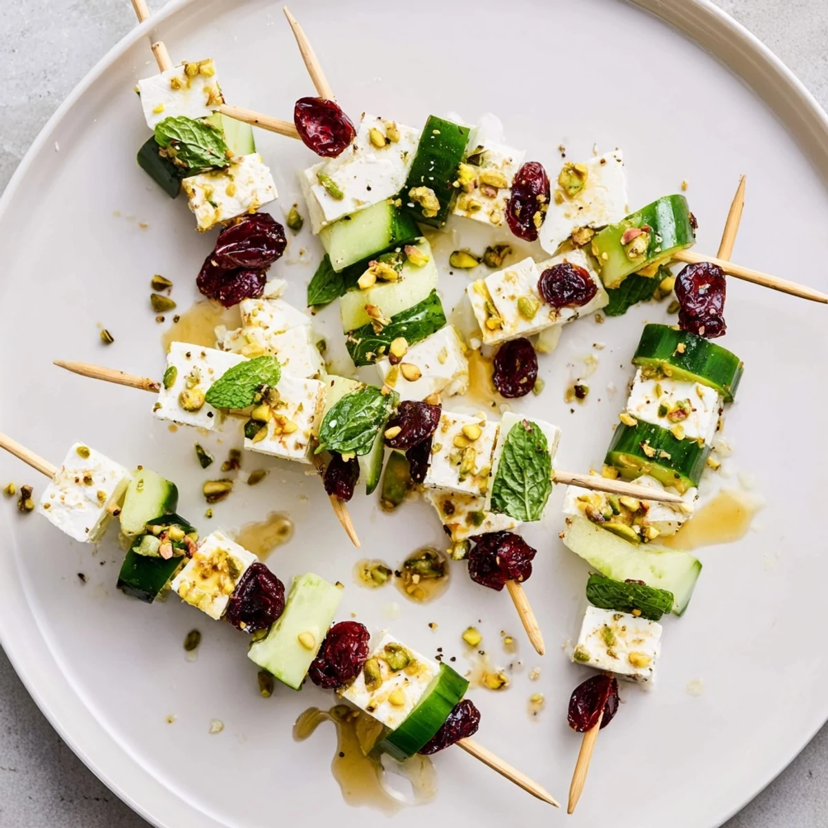 Save Festive, vibrant skewers featuring tangy feta, sweet cranberries, fresh herbs, and crunchy cucumber—perfect for holiday gatherings or as a cheerful appetizer.