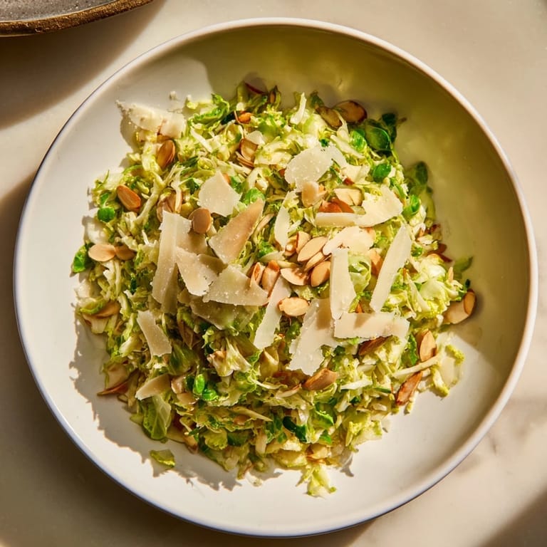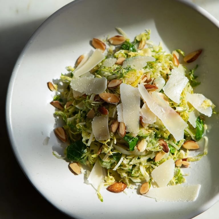 Save Discover a vibrant and refreshing salad that brings together the crispness of finely shaved Brussels sprouts with the bright zest of lemon, the satisfying crunch of toasted almonds, and the savory richness of Parmesan cheese. This Crunchy Lemon Parmesan Brussels Sprouts Salad is an easy-to-make modern European dish that requires no cooking, perfect for a quick, healthy meal or a colorful side.