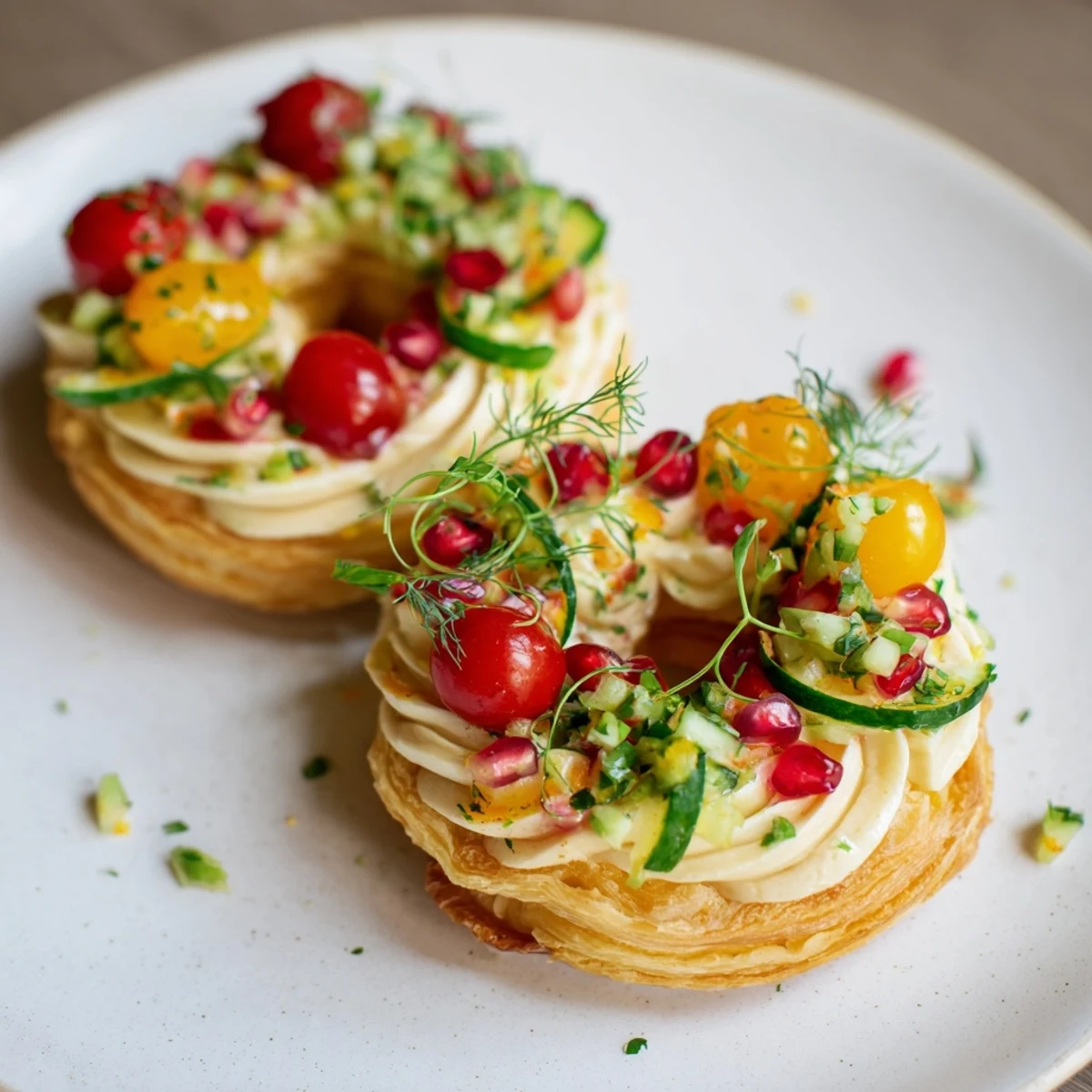 - 7. Decorate each tartlet with diced peppers, tomatoes, cucumber, pomegranate seeds, and microgreens or dill to resemble a festive wreath.